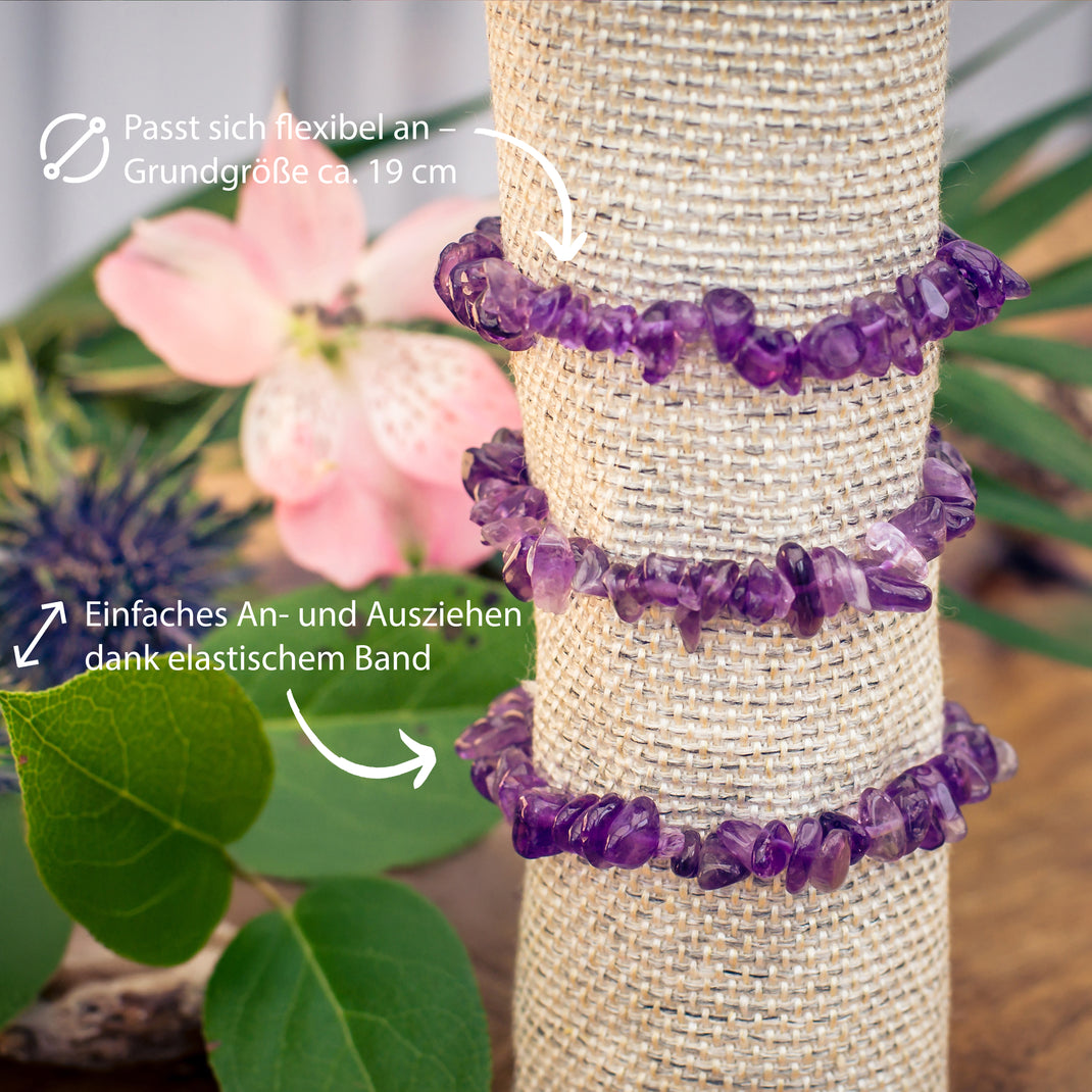 - Bracelet d'éclats d'Améthyste : Ce bracelet est composé de petites pierres roulées d'améthyste de haute qualité, avec une taille uniforme et une belle coloration naturelle.