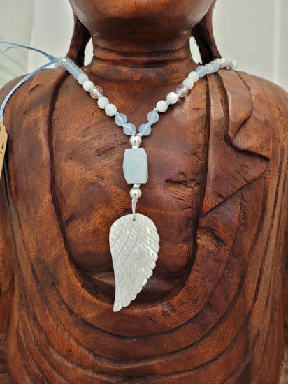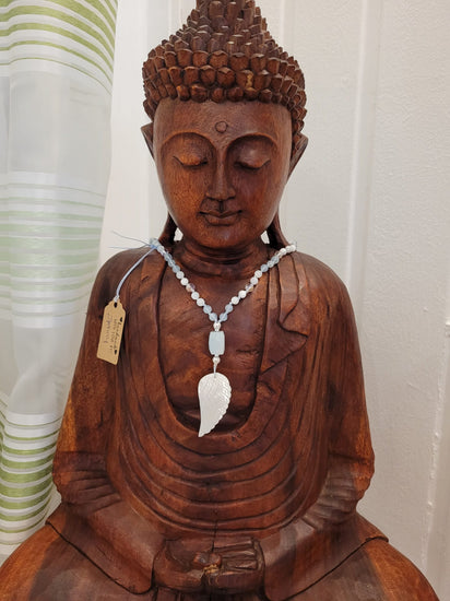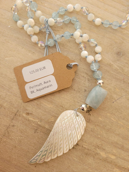 Dieses zarte und lichtvolle Mala vereint die schimmernde Eleganz des Perlmutts mit der feinstofflichen Energie des Angel Aura und der sanften Klarheit des Aquamarins. Abgerundet wird das Einzelstück durch einen kunstvoll geschnitzten Flügel-Anhänger aus Perlmutt, der Schutz, Leichtigkeit und die Verbindung zur geistigen Welt symbolisiert.