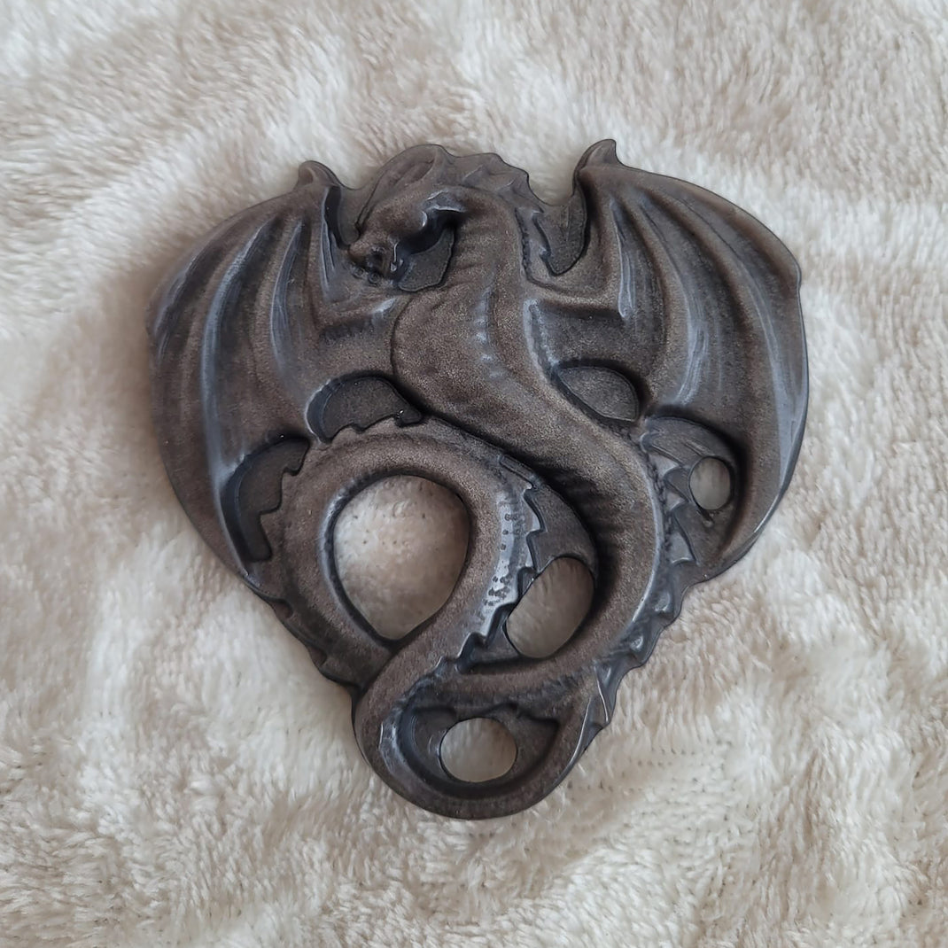 Ein wunderschöner Drache aus Silberobsidian mit einer Größe von ca. 8 × 8 cm. Dieses besondere Stück vereint Schutz, Stärke und die mystische Ausstrahlung des Silberobsidians in einer beeindruckenden Handarbeit.
