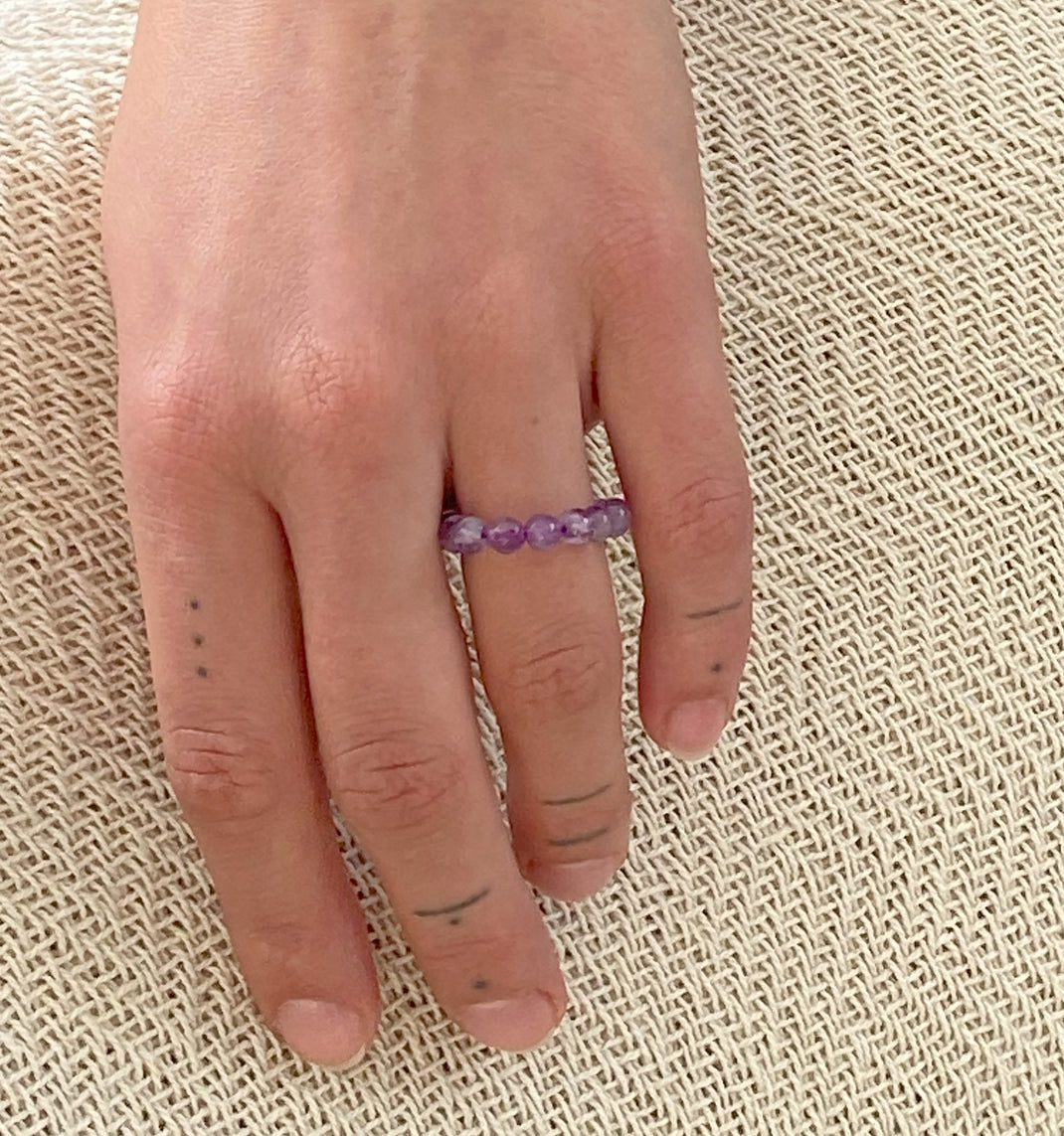 - Faszinierender Amethyst: Dieser elastische Fingerring ist mit polierten Amethystkugeln gefertigt, die in einem zarten Violett erstrahlen und für ihre beruhigende und harmonisierende Wirkung bekannt sind.