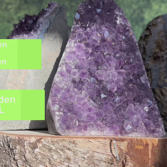 - Intensive Violett-Töne: Die Amethyst Geode zeigt eine faszinierende Palette von Violetttönen, die von tiefem Dunkelviolett bis zu zarten Lavendelnuancen reichen – ein visuelles Highlight in jedem Raum.