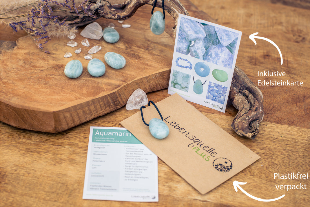 - Inklusive einer Edelsteinkarte. Eine liebevoll gestaltete Edelsteinkarte zum Aquamarin mit allen nützlichen Informationen zum Sternzeichen, Chakra und den nachgesagten Heilwirkungen ist ebenfalls enthalten.