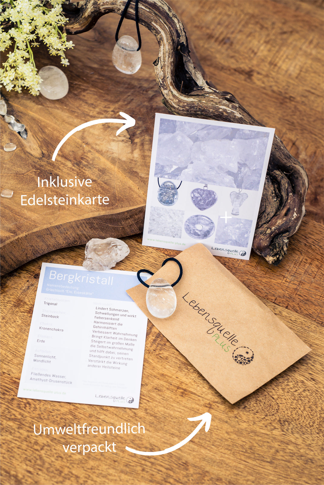 - Inklusive einer Edelsteinkarte. Eine liebevoll gestaltete Edelsteinkarte zum Bergkristall mit allen nützlichen Informationen zum Sternzeichen, Chakra und der nachgesagten Heilwirkungen ist ebenfalls enthalten.
