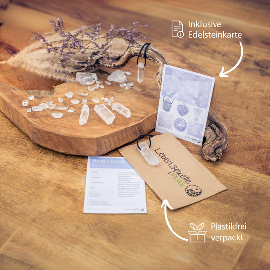 - Set Angebot aus einer Bergkristall Natur-Spitze inklusive einem anschmiegsamen Band zum sofortigen Einsatz und für einen angenehmen Tragekomfort. Dadurch eignet sich das Set auch als ideales Geschenk für einen lieben Menschen.
