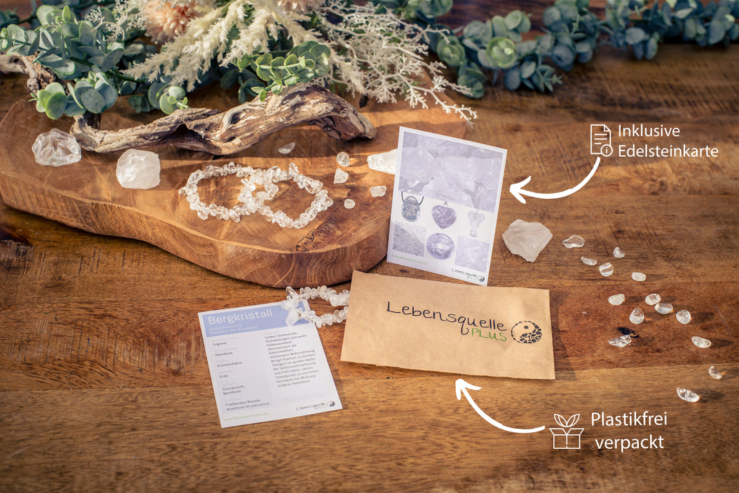 - Inklusive einer Edelsteinkarte: Eine liebevoll gestaltete Edelsteinkarte zum Bergkristall mit allen nützlichen Informationen zum Sternzeichen, Chakra und der nachgesagten Heilwirkungen ist ebenfalls enthalten