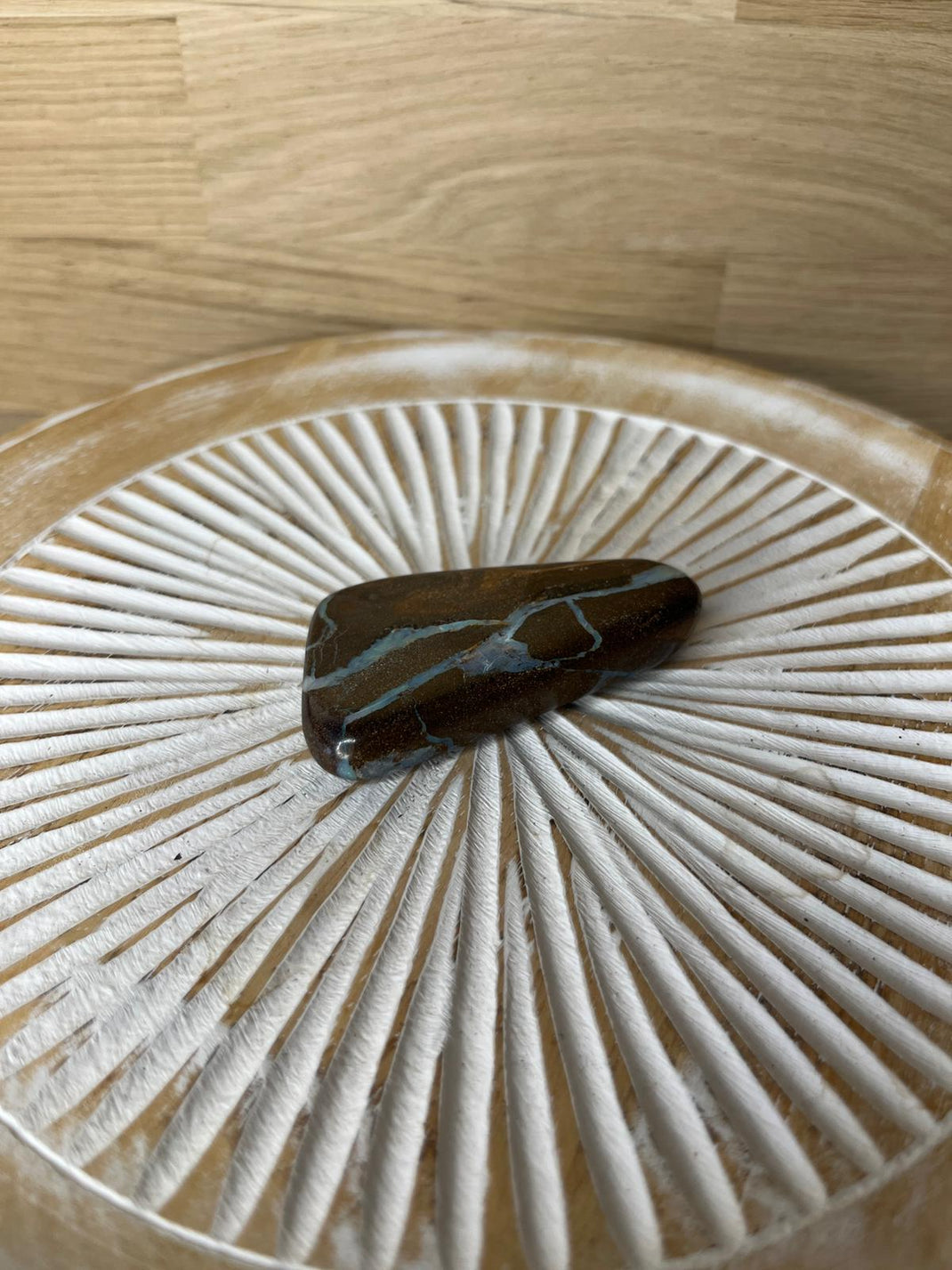 - Boulder Opal -Trommelstein: Der Boulder-Opal fasziniert mit lebendigen Farben und natürlicher Struktur, die seine besondere Energie betont. Seine polierte Oberfläche bringt den einzigartigen blauen Schimmer besonders zur Geltung.