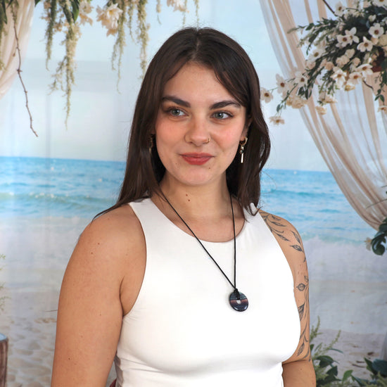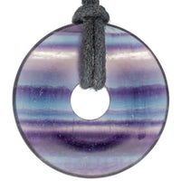 Bunter Fluorit Donut Ein faszinierender Donut aus buntem Fluorit mit seiner charakteristischen Farbvielfalt von zartem Grün bis hin zu intensivem Violett. Das Set enthält ein 100 cm langes schwarzes Baumwollband ohne Verschluss, perfekt für flexible Trageoptionen.