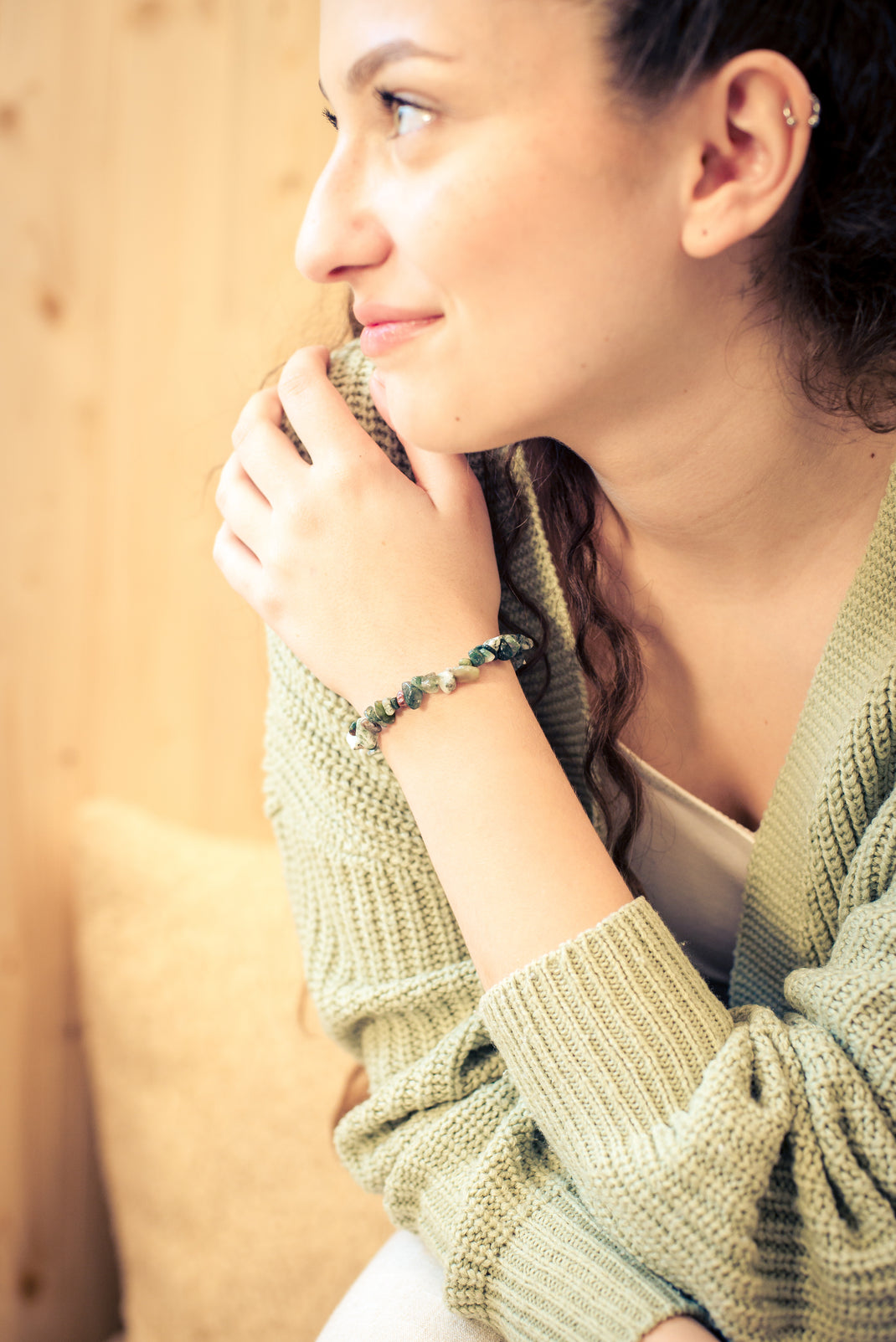- Natürliche Eleganz Die Mischung aus tiefem Grün und zarten rötlichen Akzenten des Heliotrops macht das Armband zu einem zeitlosen Begleiter.