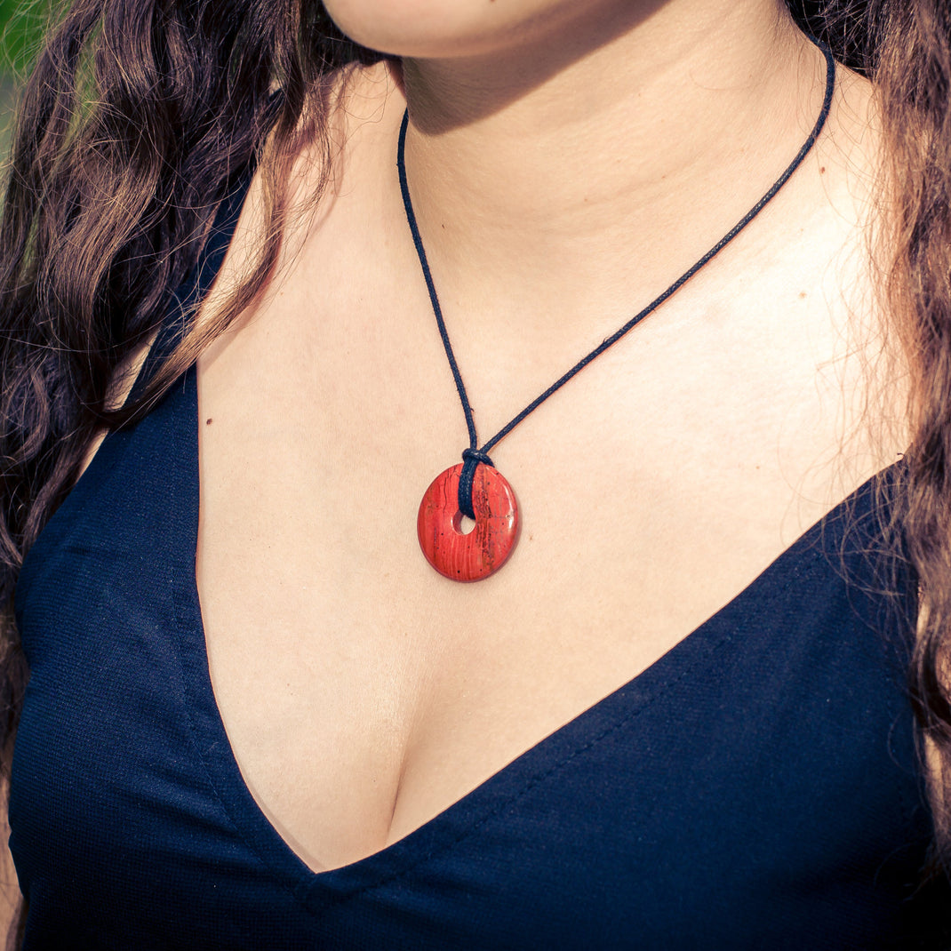 - Vielseitiges Accessoire Die tiefrote Farbe und die natürliche Maserung des Jaspis machen diesen Donut zu einem vielseitigen Schmuckstück, das sich mühelos in verschiedene Outfits einfügt.