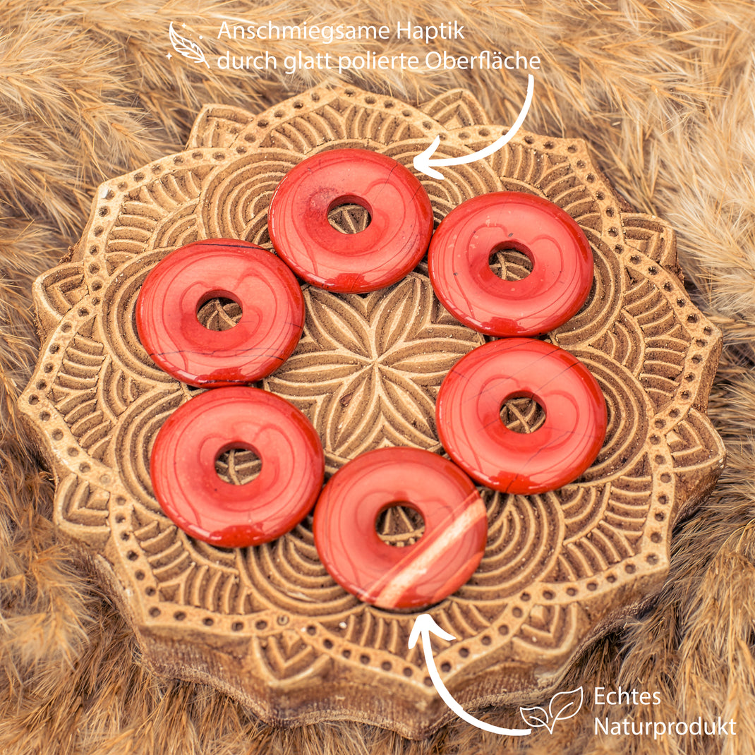 - Roter Jaspis Donut Der leuchtend rote Jaspis Donut mit einem Durchmesser von 3 cm zieht mit seiner natürlichen Farbgebung und intensiven Ausstrahlung alle Blicke auf sich.