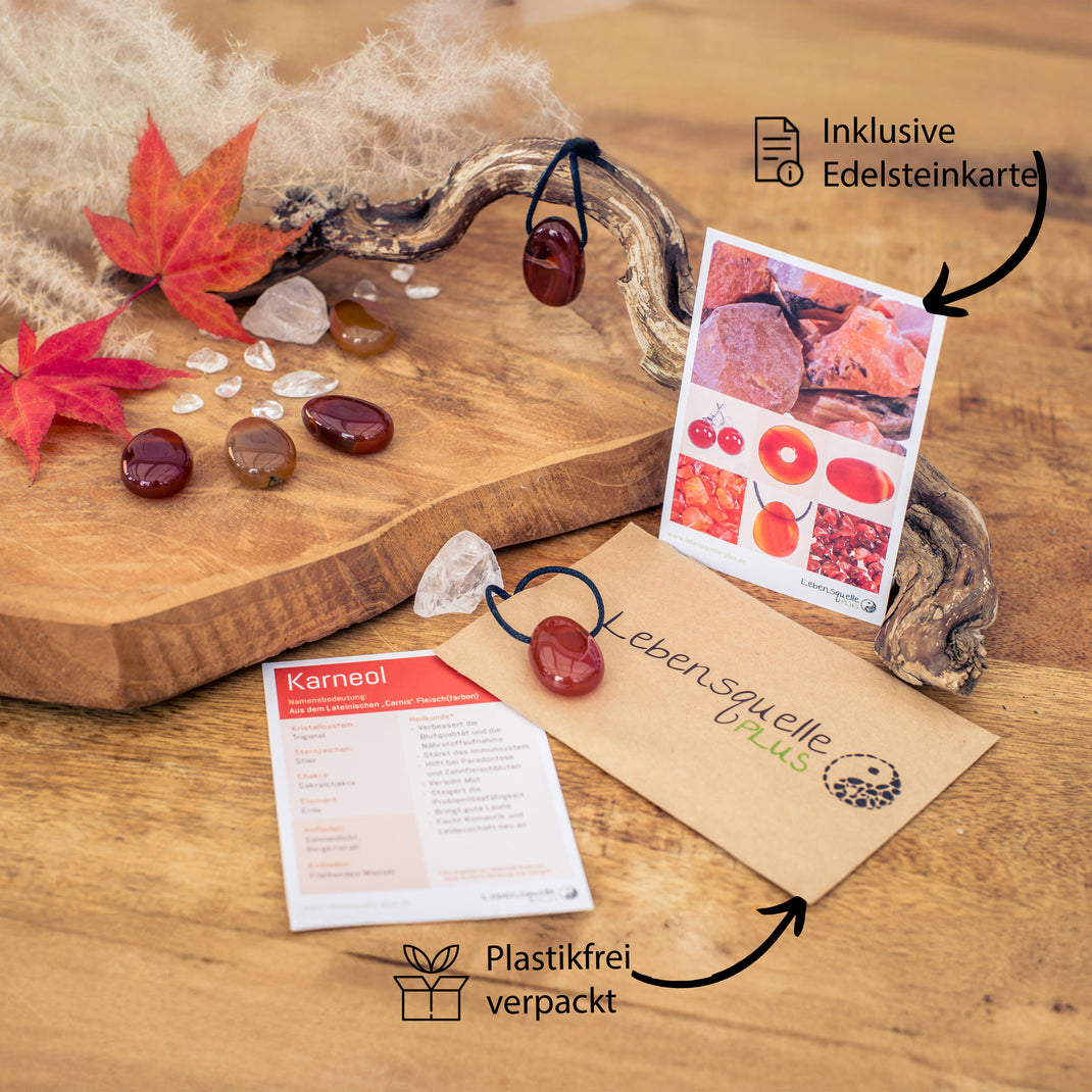 Set-Angebot: Orange-roter Karneol-Anhänger inklusive weichem Baumwollband – sofort tragbar, angenehm zu tragen und ideal als Geschenk.