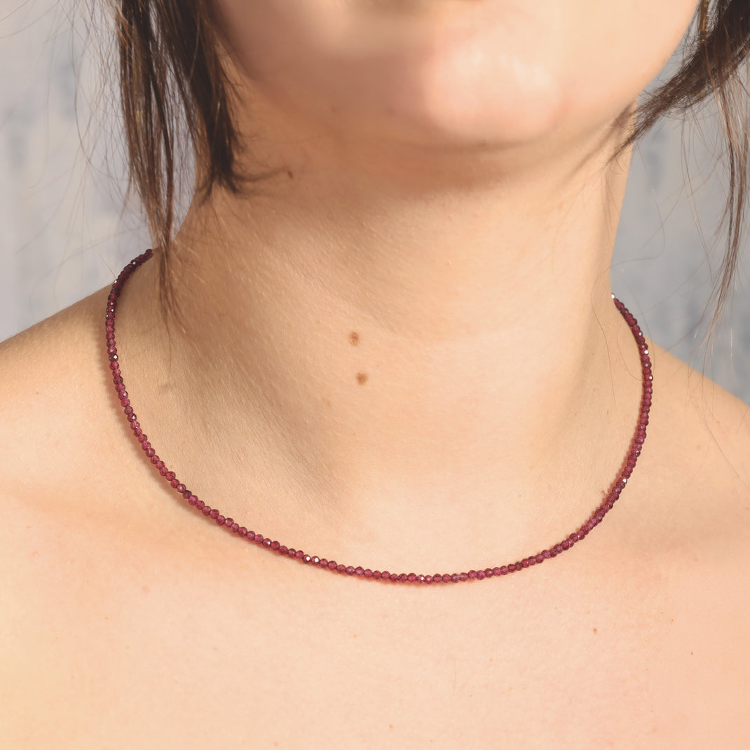 Besonders fein und funkelnd: Die facettierten Granatperlen mit ca. 2 mm Durchmesser schimmern in tiefem Rot und verleihen der Kette eine edle, warme Ausstrahlung.