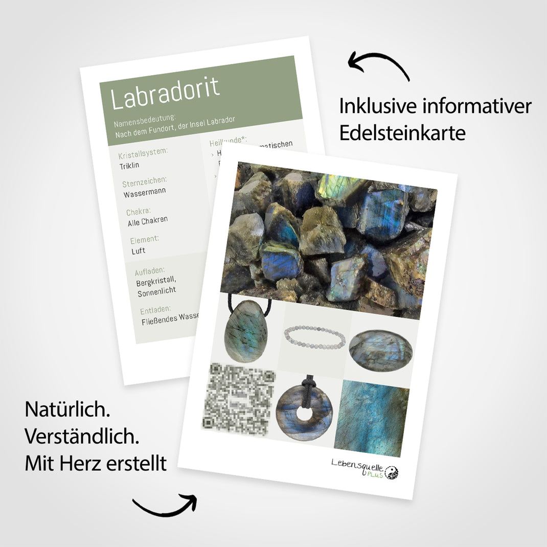 - Inklusive einer Edelsteinkarte. Eine liebevoll gestaltete Edelsteinkarte zum Labradorit mit allen nützlichen Informationen zum Sternzeichen, Chakra und der nachgesagten Heilwirkungen ist ebenfalls enthalten.