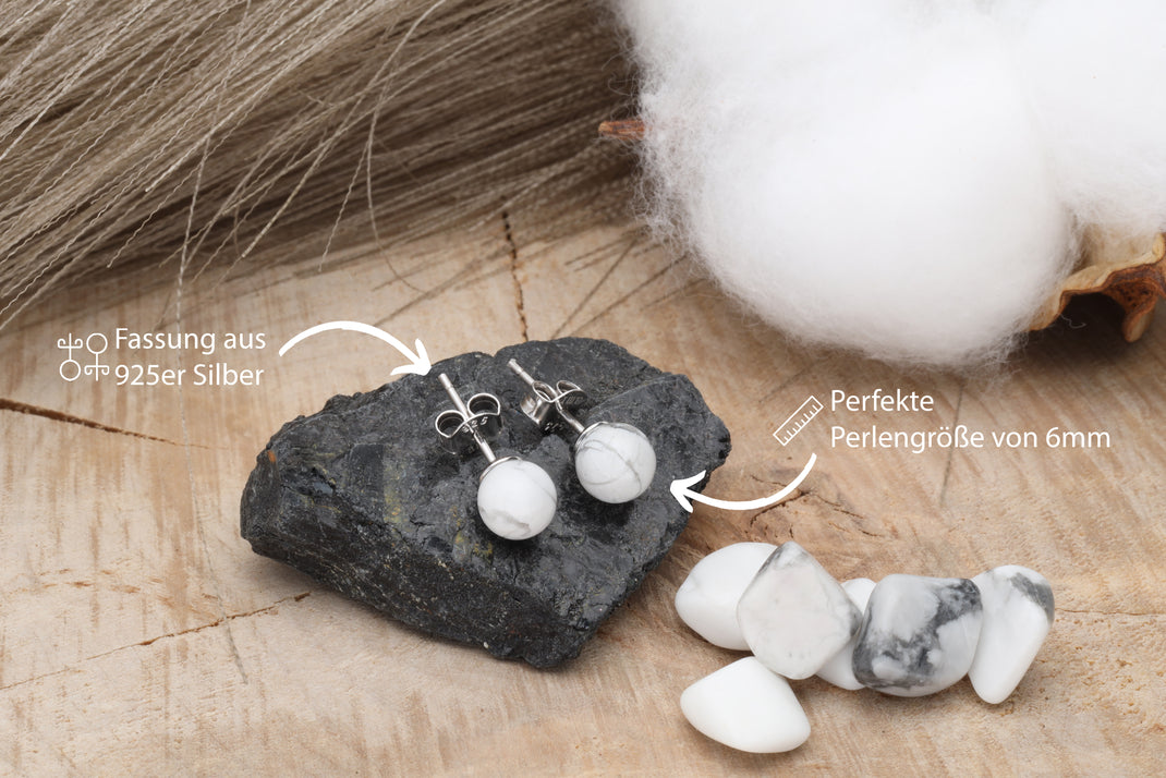 - Die Fassung aus 925er Silber fügt den Ohrsteckern einen Hauch von Raffinesse und schafft einen eleganten Kontrast zum beruhigenden Weiß des Magnesits, das an reine Gedanken erinnert.