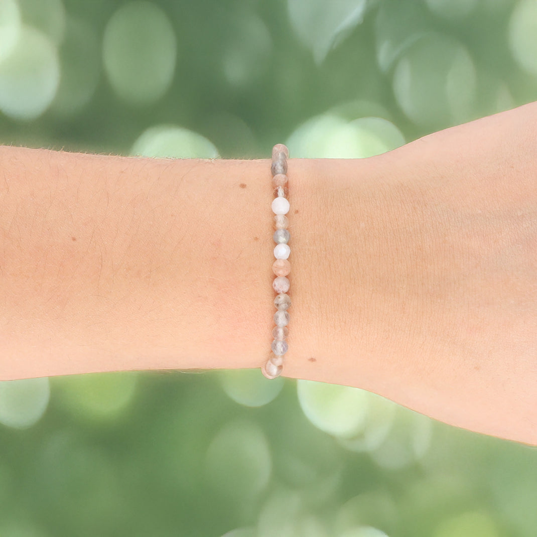 - Facettierte Kugeln in 4 mm Größe bringen das charakteristische Schimmern des Mondsteins besonders schön zur Geltung. Jede Bewegung fängt das Licht neu ein, sodass ein feines Spiel aus Reflexen und Farbnuancen entsteht, das das Armband lebendig wirken lässt.