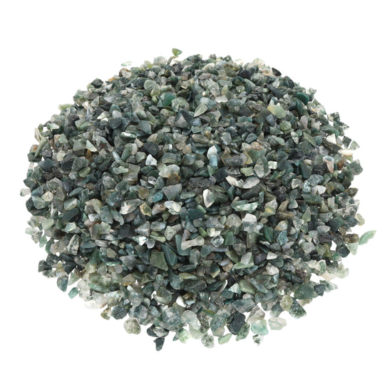 - Getrommelte Edelsteinchips aus Moosachat – Mit einer typischen weiß-grünlichen Farbgebung, durchzogen von moosartigen Strukturen – natürlich, sanft und lebendig.
