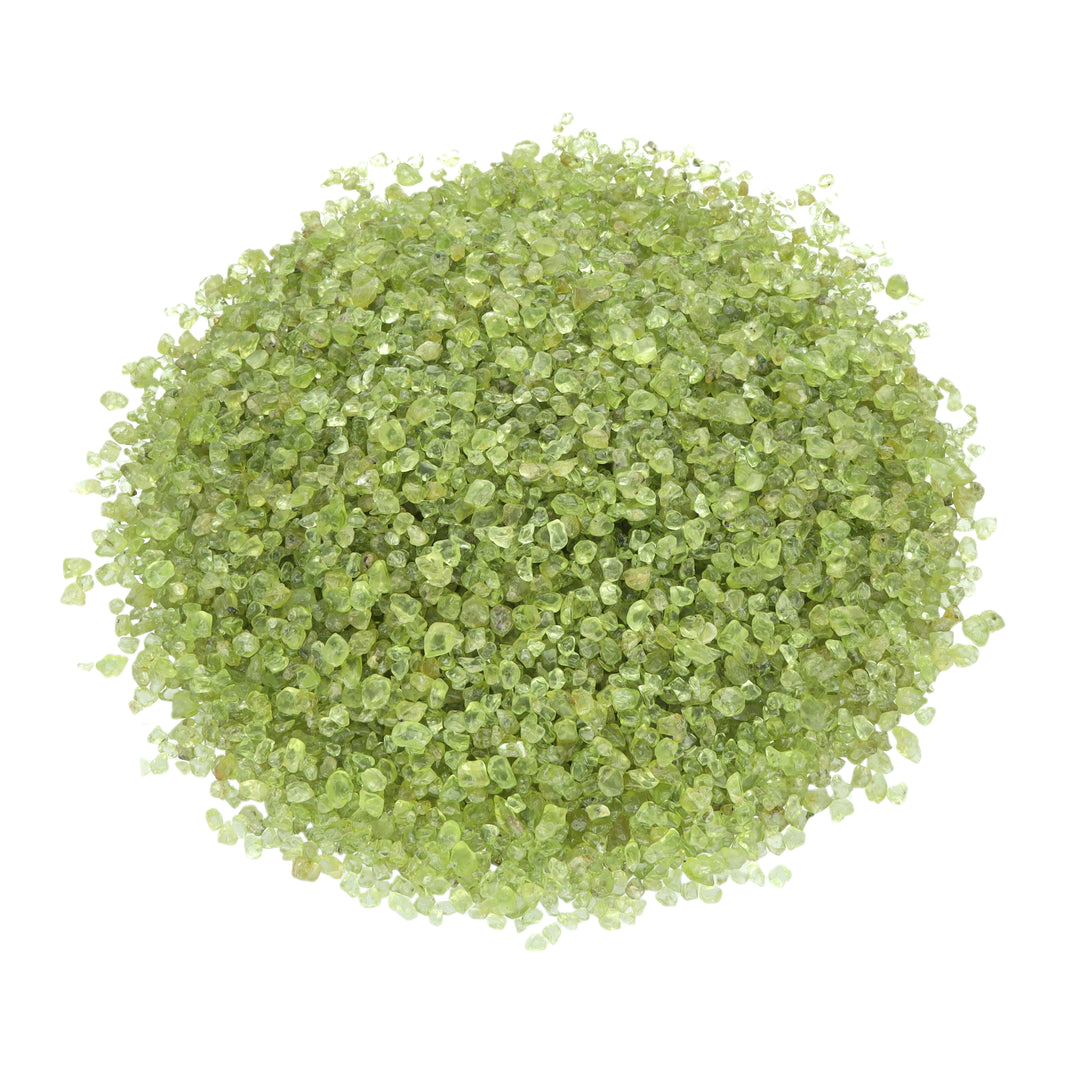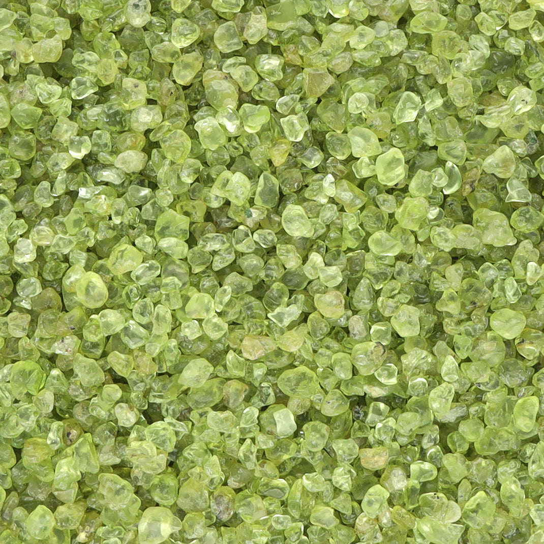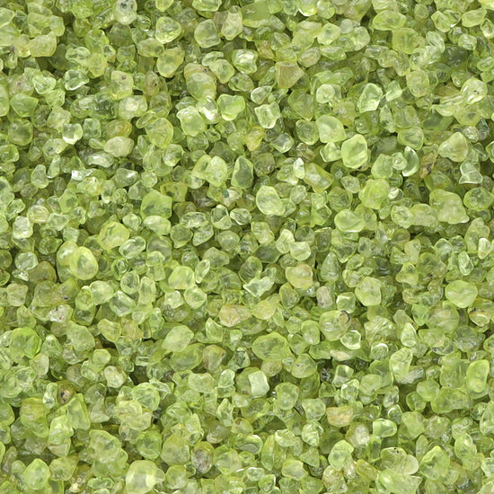 - Getrommelte Edelsteinchips aus Peridot – Mit einer charakteristischen, frischen hellgrünen Farbgebung, die an junge Blätter erinnert und Leichtigkeit ausstrahlt.