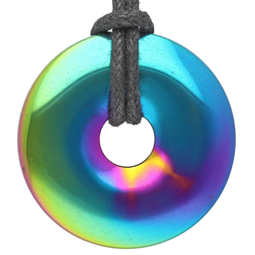 Regenbogen-Hämatit Donut Ein eindrucksvoller Donut aus bedampftem Hämatit mit schimmerndem Farbspiel in Regenbogenfarben, das jedes Outfit bereichert. Das 100 cm lange schwarze Baumwollband ohne Verschluss bietet flexible Tragemöglichkeiten.