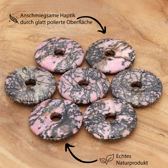 Glatt polierte Oberfläche Sorgfältig geschliffen und poliert, liegt der Donut angenehm auf der Haut und bringt die natürliche Schönheit des Rhodonits zur Geltung.