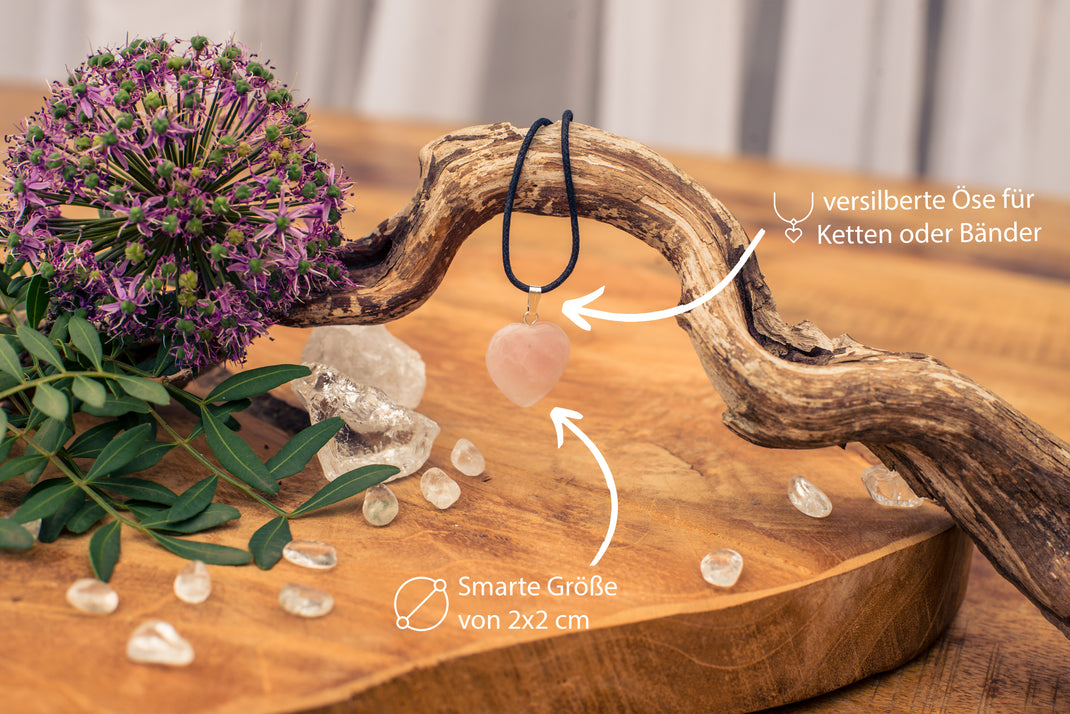 - Eleganter Herzanhänger aus Rosenquarz: Der Anhänger beeindruckt durch die zarte, rosafarbene Schönheit des Rosenquarzes und seine kompakte Größe von 2 x 2 cm, die eine sanfte Ästhetik verleiht.