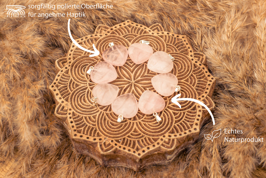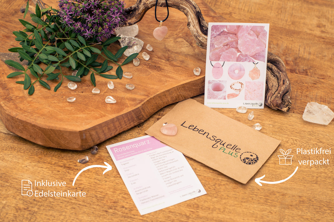 - Inklusive Edelsteinkarte mit Details: Jeder Anhänger wird mit einer liebevoll gestalteten Edelsteinkarte geliefert, die über die besonderen Eigenschaften und die Symbolik des Rosenquarzes informiert.