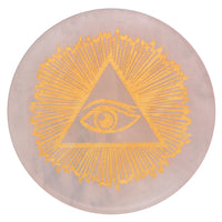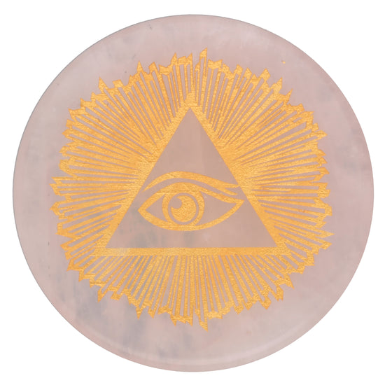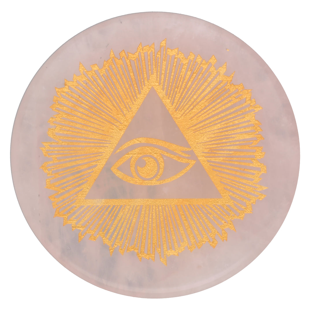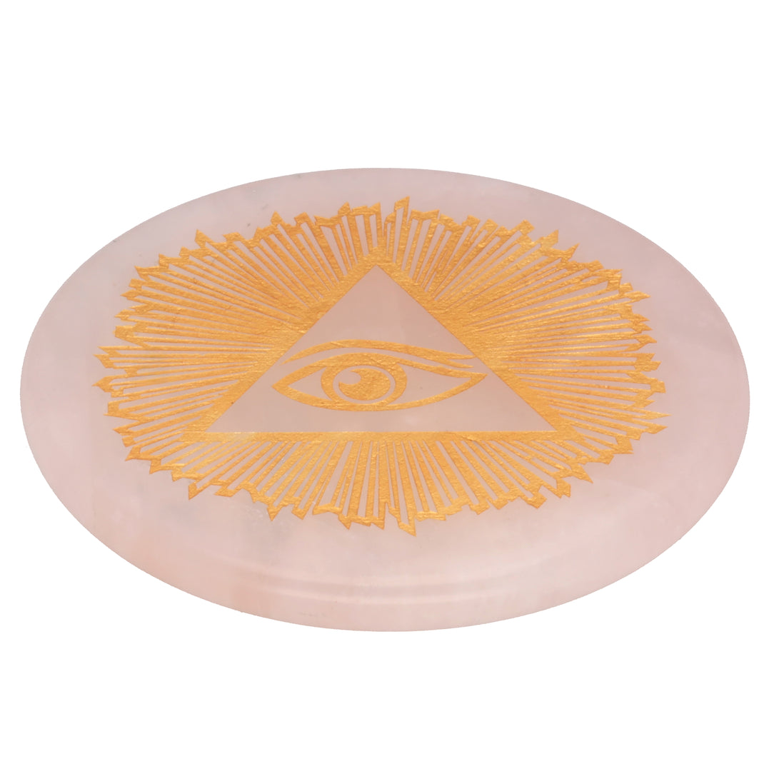Rosenquarz Scheibenstein mit goldener Gravur - Allsehendes Auge