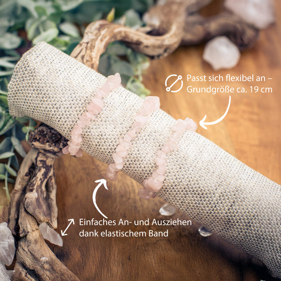 - Bezaubernde Romantik: Das Rosenquarz Splitterarmband bezaubert mit seinem zarten Rosa, das Liebe und Zärtlichkeit symbolisiert.
