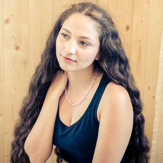 Elegante Rosenquarzkette – Diese Halskette zeichnet sich durch ihre hochwertigen Rosenquarz-Splitter aus.