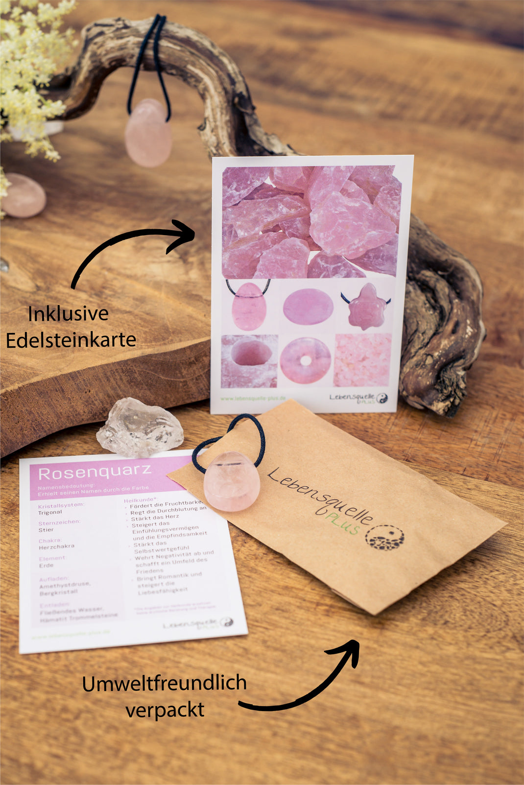 - Inklusive einer Edelsteinkarte. Eine liebevoll gestaltete Edelsteinkarte zum Rosenquarz mit allen nützlichen Informationen zum Sternzeichen, Chakra und den nachgesagten Heilwirkungen ist ebenfalls enthalten.