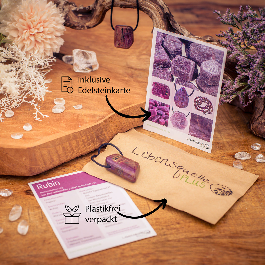 - Inklusive einer Edelsteinkarte. Eine liebevoll gestaltete Edelsteinkarte zum Rubin mit allen nützlichen Informationen zum Sternzeichen, Chakra und den nachgesagten Heilwirkungen ist ebenfalls enthalten. Mit dieser Karte können Sie mühelos herausfinden, wie Sie diesen vielseitigen Heilstein am besten nutzen können.
