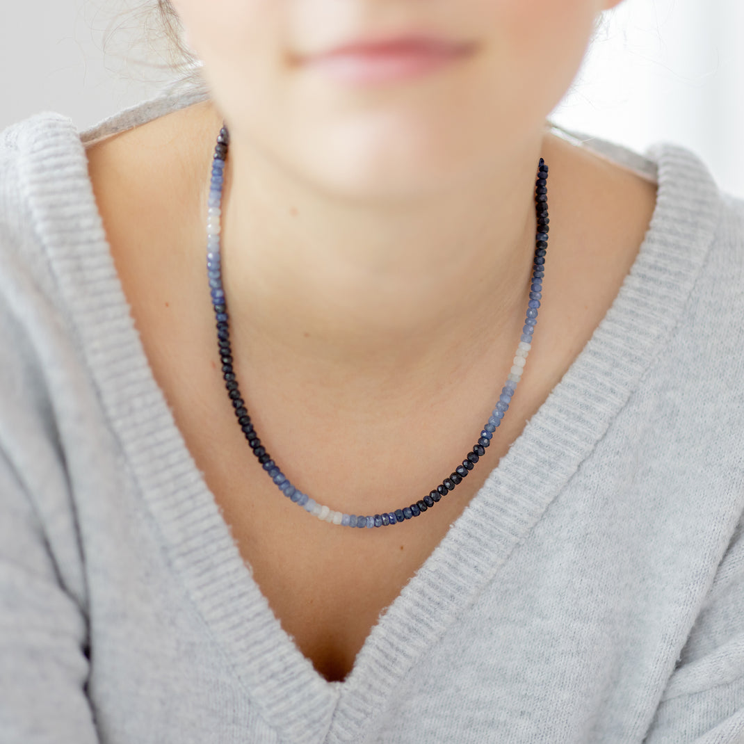 - Elegante Saphir-Halskette: Diese exquisite Kette präsentiert eine Abfolge von facettierten Saphirperlen, die von tiefem Mitternachtsblau bis hin zu zartem Himmelblau reichen, für ein edles Farbspiel am Dekolleté.