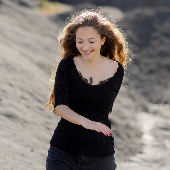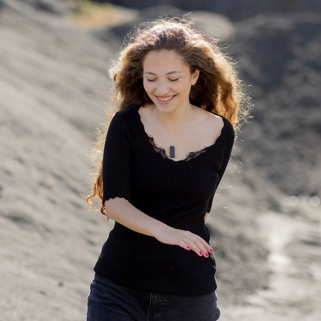 Individuell einstellbar: Das schwarze Baumwollband (ca. 100 cm) lässt sich flexibel in der Länge anpassen – wahlweise locker getragen oder kürzer und elegant am Hals.