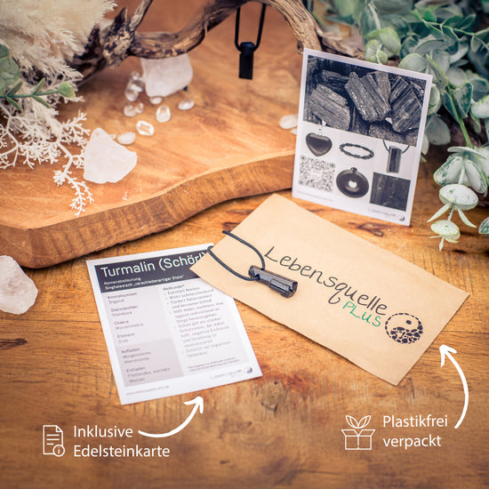 Mit Edelsteinkarte: Beinhaltet eine liebevoll gestaltete Karte mit Informationen zu Sternzeichen, Chakra und den traditionellen Bedeutungen des schwarzen Turmalins.