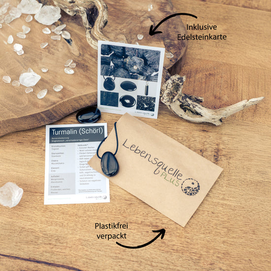 Mit Edelsteinkarte – Beinhaltet eine liebevoll gestaltete Karte mit Infos zu Sternzeichen, Chakra und den überlieferten Bedeutungen des schwarzen Turmalins.