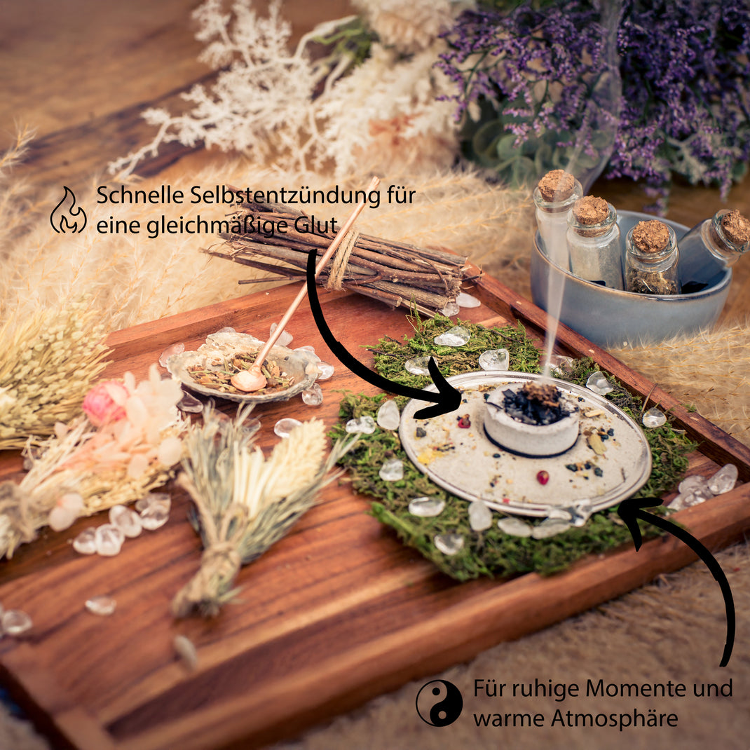 Konstante & zuverlässige Glut: Die Premium-Mischung sorgt für eine gleichmäßige Brenndauer, ideal für Rituale, Meditation oder zur Raumenergetisierung.