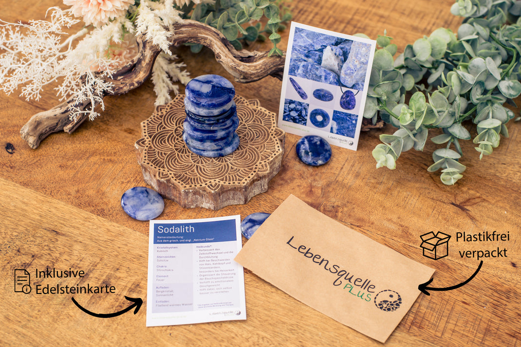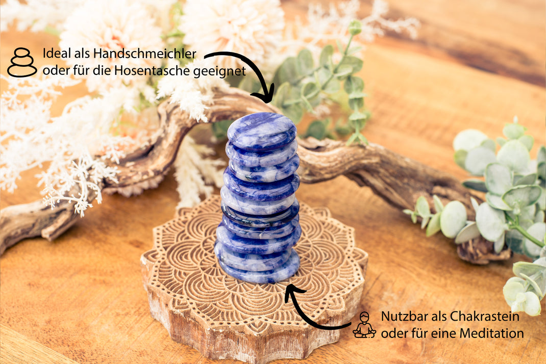 - Markante Farbgebung: Sodalith-Scheibensteine in tiefen Blautönen mit weißen Marmorierungen, die jedem Raum eine kühle Eleganz verleihen.