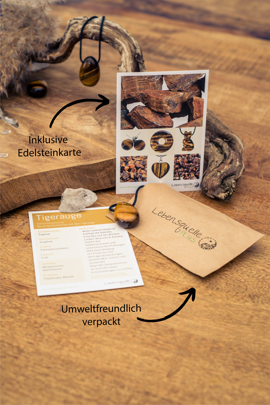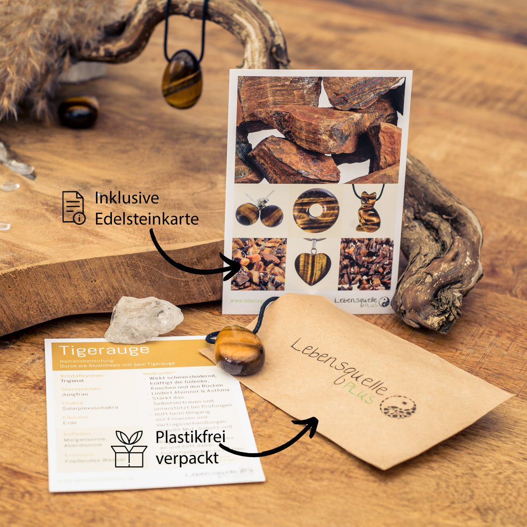 - Inklusive einer Edelsteinkarte. Eine liebevoll gestaltete Edelsteinkarte zum Tigerauge mit allen nützlichen Informationen zum Sternzeichen, Chakra und den nachgesagten Heilwirkungen ist ebenfalls enthalten.