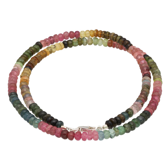 Echter, facettierter Turmalin in natürlicher Vielfarbigkeit – Von zartem Rosa über sattes Grün bis hin zu dunklen Beerentönen, sorgfältig aufgereiht zu einem harmonischen Farbverlauf.